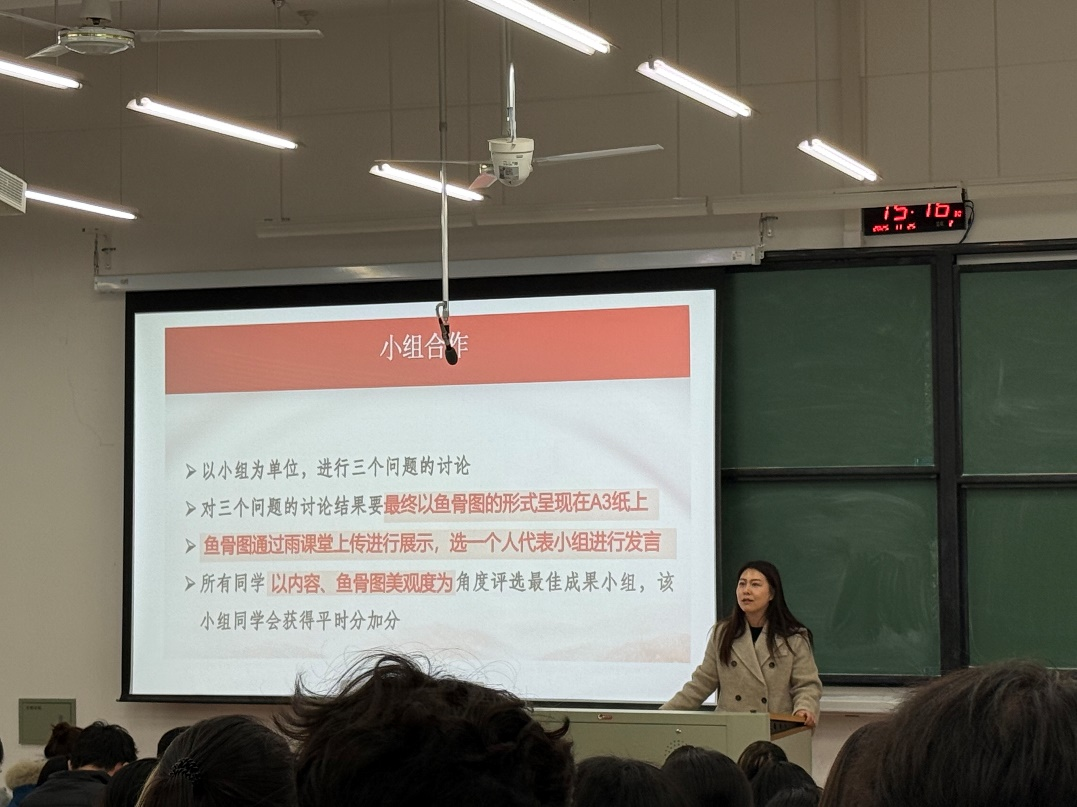 在正式开始前,张笑笑老师提前布置分组任务,介绍讨论流程,以讲解“思考帽”的方式引导学生如何厘清逻辑及组织语言,为课堂正式开始做好准备。研讨过程中,学生围绕“民生问题包括哪几个方面”、“我国民生建设取得了哪些成就”、“目前还存在哪些问题及努力方向”三个问题展开激烈讨论,张笑笑老师也走下讲台,穿行在各个小组间,深度参与和指导学生讨论。最后,小组代表以绘制“鱼骨图”+上传“雨课堂”的方式分享讨论结果,数字共享+实践共创的方式将课堂推向高潮。