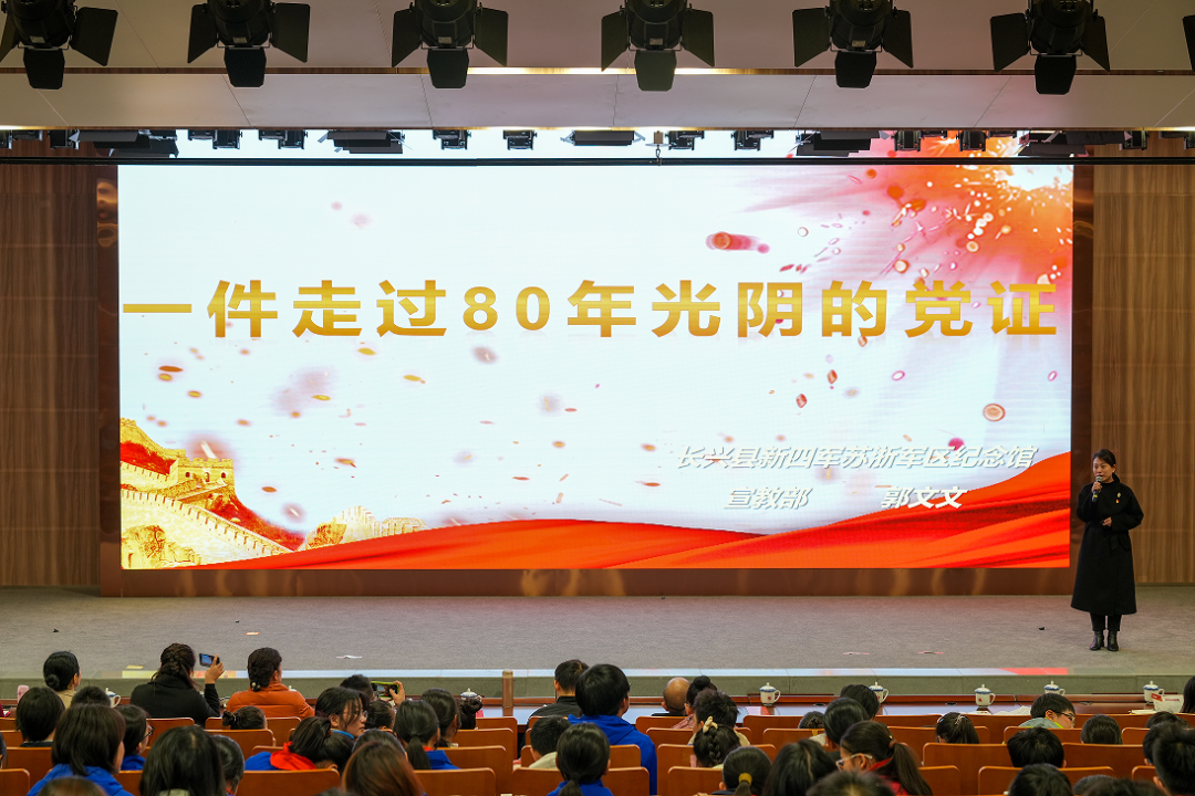 新四军苏浙军区纪念馆讲解员郭文文主讲题为《一件走过80年光阴的党证》的思政课。她以国家一级文物“抗战时期新四军在苏浙皖边区印制的唯一一种党证”为切入点,讲述了珍贵文物的时代背景及其历史意义,将听众带回到那个烽火连天、民族危亡的艰难岁月,让人们深切感受到中国共产党在抗日战争中所发挥的中流砥柱作用。