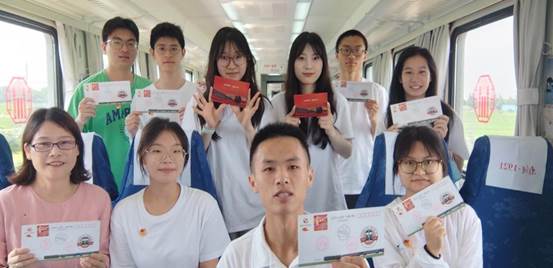 第二天同学们坐上Y701次“南湖·1921”红色旅游列车,跟随革命先辈的脚步从上海乘火车来到嘉兴,在嘉兴火车站老站房前驻足参观,又步行前往狮子汇渡口,在中共“一大”代表雕像群前追寻红色记忆。