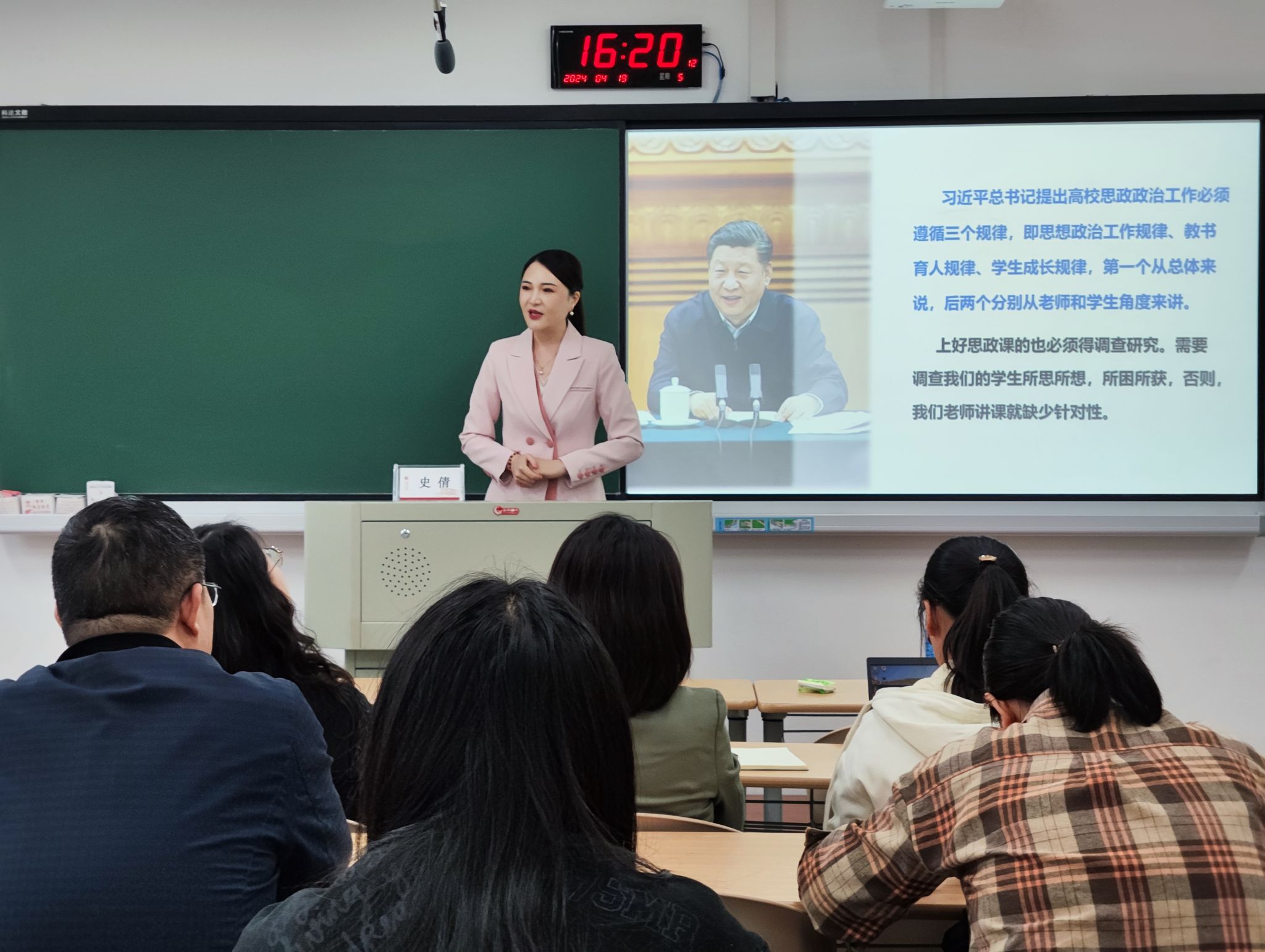 史倩采用生动的案例和深入浅出的讲述方式,向与会的教师们阐释了如何在课堂上让思政课"讲深、讲透、讲活",并强调必须"真学、真信、真懂、真用",才能达到培养学生正确世界观、人生观和价值观的目标。她指出,思政课教学不仅要坚持理论联系实际,更要注重理论的吸收与运用,使学生能够在参与实践的过程中加深对马克思主义理论的理解和认识。