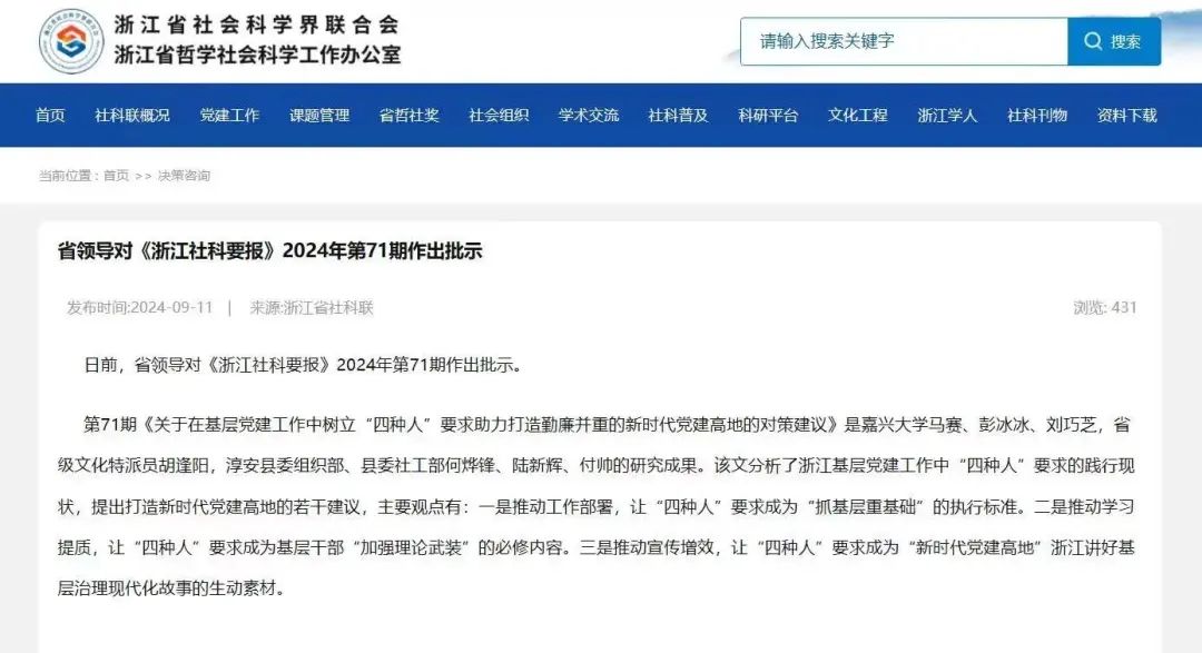 教师主持完成撰写的调研报告《关于在基层党建工作中树立“四种人”要求助力打造勤廉并重的新时代党建高地的对策建议》被《浙江社科要报》2024年第71期采用,并获省领导肯定性批示。