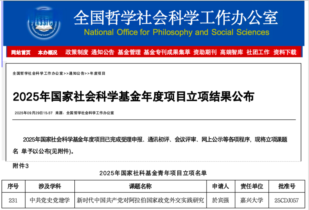於宾强博士主持申报的青年项目《新时代中国共产党对阿拉伯国家政党外交实践研究》(25CDJ057)获批立项资助。